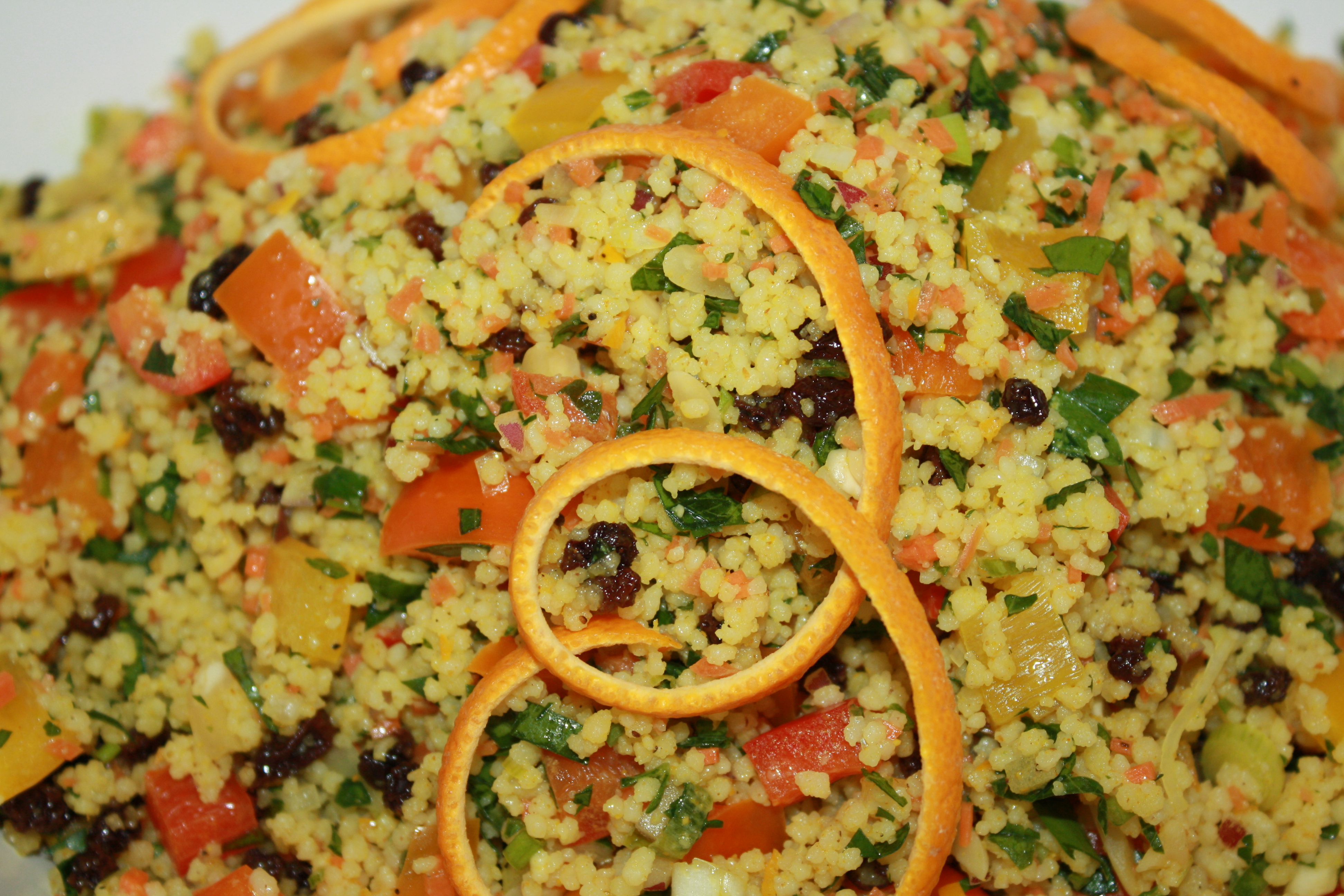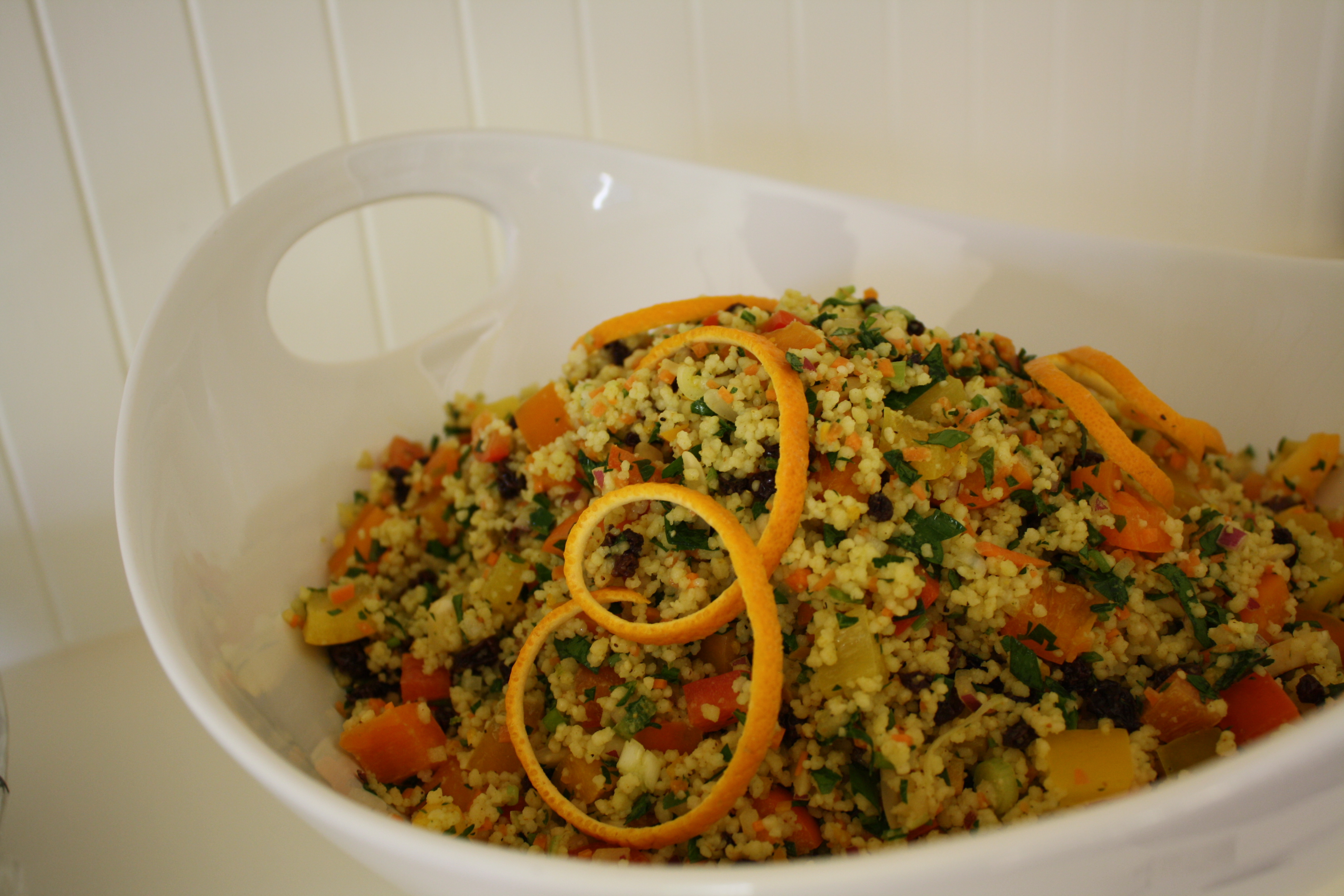 3. Pour over the fluffed cous cous and mix well with a fork. (You might not need all of the dressing. Add half of dressing, then the remaining ingredients, then mix and taste. Use more dressing as needed.) Add the peppers, parsley, currants, almonds, scallions, and red onions. Mix well and taste for seasonings. Serve at room temperature.