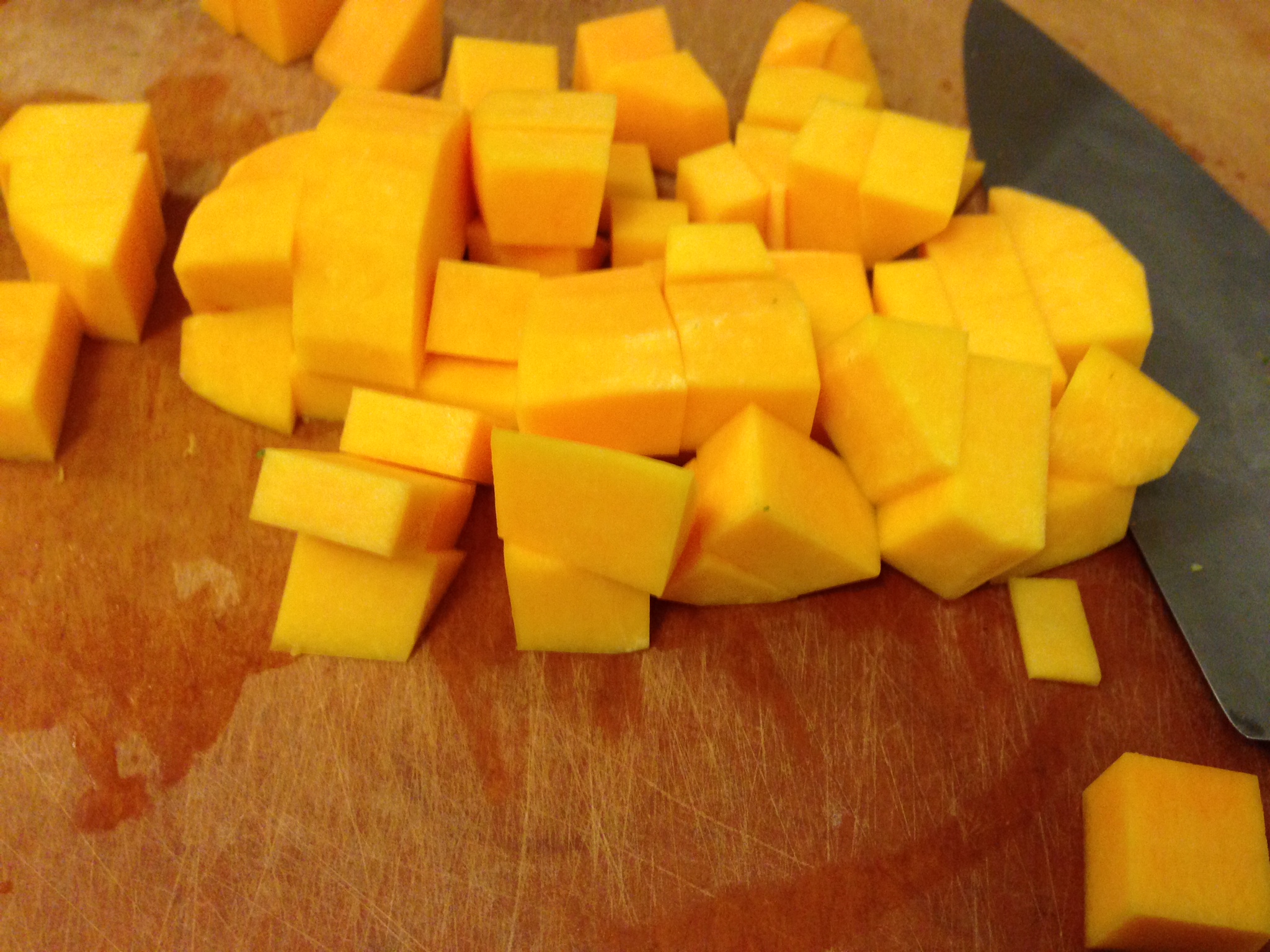 Peel the squash, then cut it in quarters, and scoop out the seeds. Cut into half-inch to 1-inch cubes and toss with olive oil until lightly but evenly coated. Season with salt.