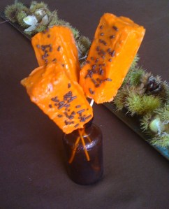 Use a 3 inch offset spatula (I have an Ateco Ultra #1305) or a butter knife to frost the treats with the orange-colored white chocolate.