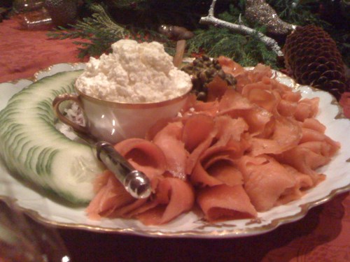 Lox with Cucumbers, Red Onions, Capers and Cream Cheese.