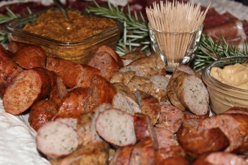 Chorizo, Andouille and Mild Italian Sausages and preserved meats, such as Prosciutto, with two different types of mustard make up this Charcuterie Platter.