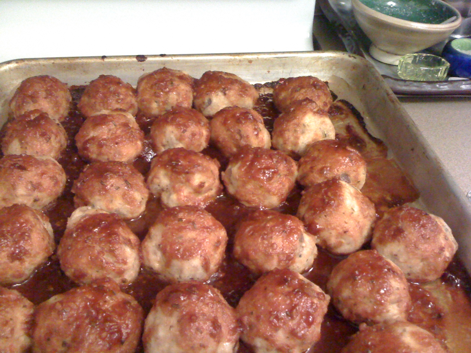 NOTE: I do not always cook the meatballs in the sauce. Sometimes I bake them–in a 400-degree oven for about 30 minutes–on a sheet pan that I prepare by spraying it with cooking spray and lining it with parchment paper. (As seen in the photo above. The meatballs in the photo are also glazed with the sauce from my Turkey Meatloaf post.)