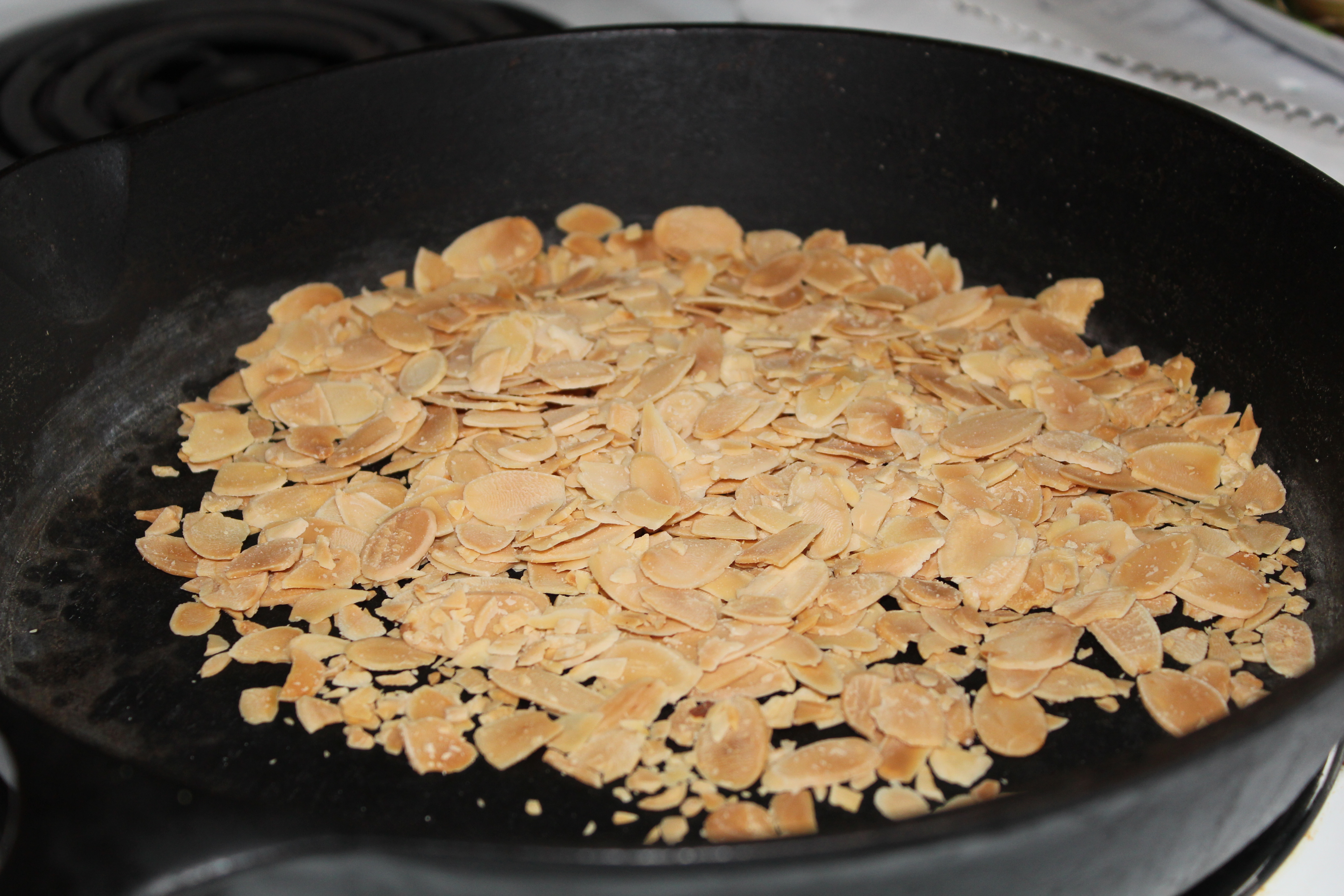 Toast almonds in a 350° F oven for about 15 minutes, stirring every 5 minutes. (I used a cast iron pan, as shown in the photo at right.)