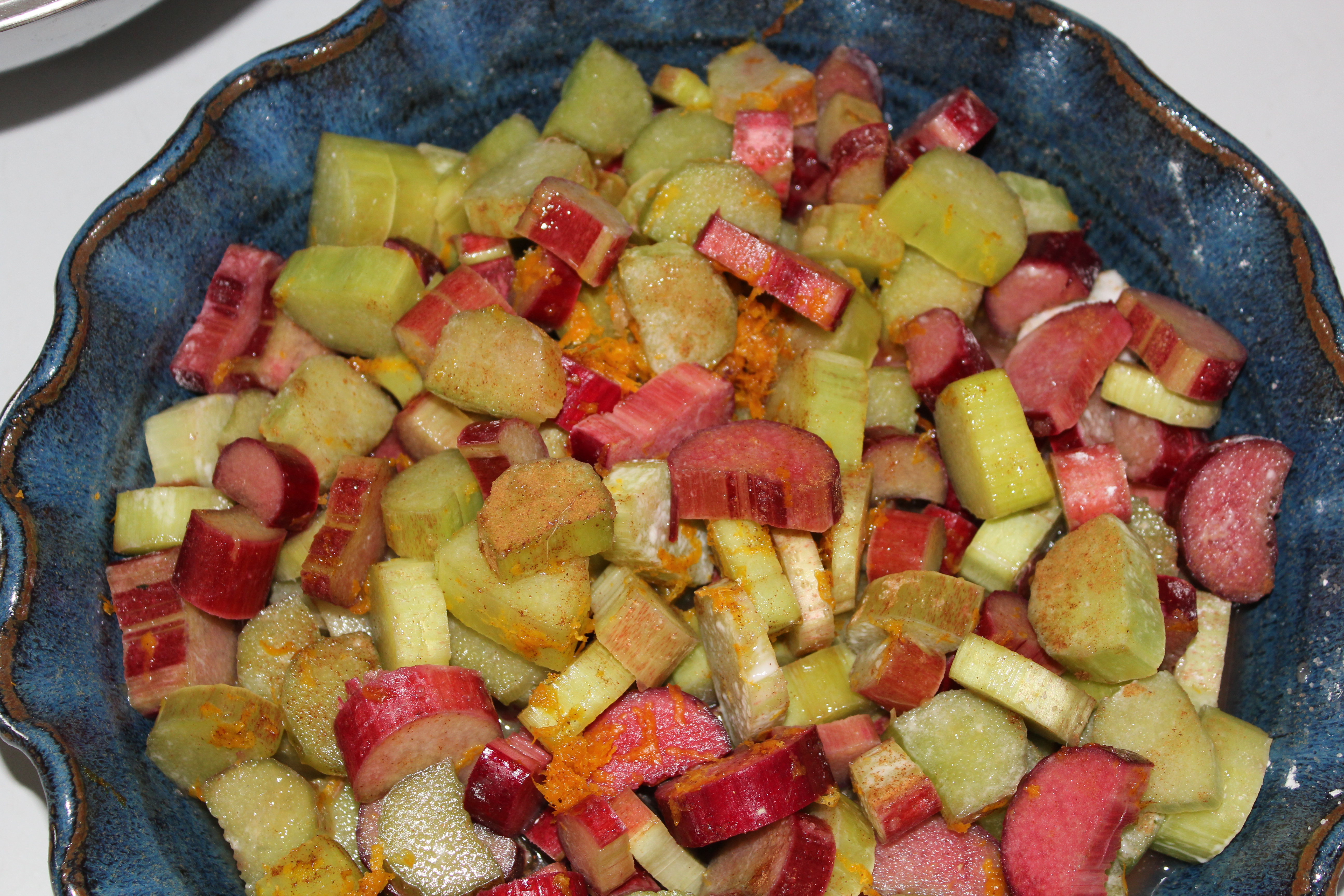 To assemble: Remove rhubarb from oven, and increase oven temperature to 425° F. Pinch off eight equal pieces of dough and place them on the hot fruit filling, spacing them at least ½ inch apart (they should not touch). Sprinkle each mound of dough with cinnamon sugar. Bake until filling is bubbling and biscuits are golden brown on top and cooked through (15-18 minutes). Cool cobbler on a wire rack for about 20 minutes and serve.