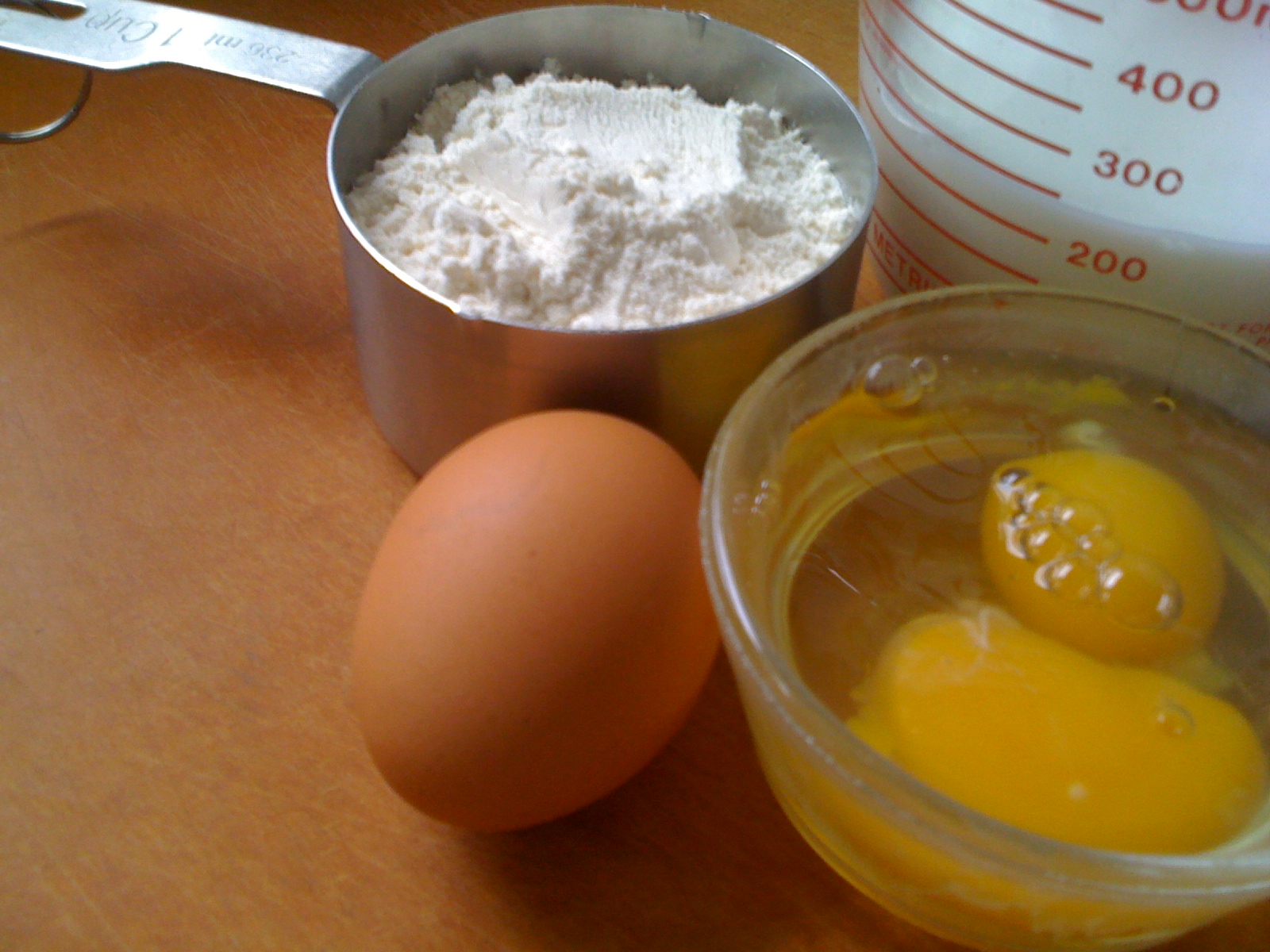 In a blender or food processor, blend egg for 1 minute. Gradually pour in milk, then slowly add flour. Whirl for 30 more seconds once all of the flour has been added.