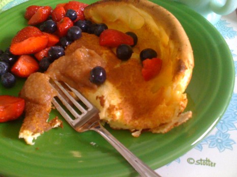 Bake for about 20-25 minutes or until it is set in the middle. (although it is basically a popover, so try not to oven the oven door nor bake loud noises or it might “fall.”)