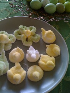 I confess I borrowed this recipe for Marshmallow “Peeps”® from Martha Stewart, and I have to agree with her that fresh, homemade marshmallows taste much better than the ones that come from a grocery store shelf, no matter what color (or how cute) they are.