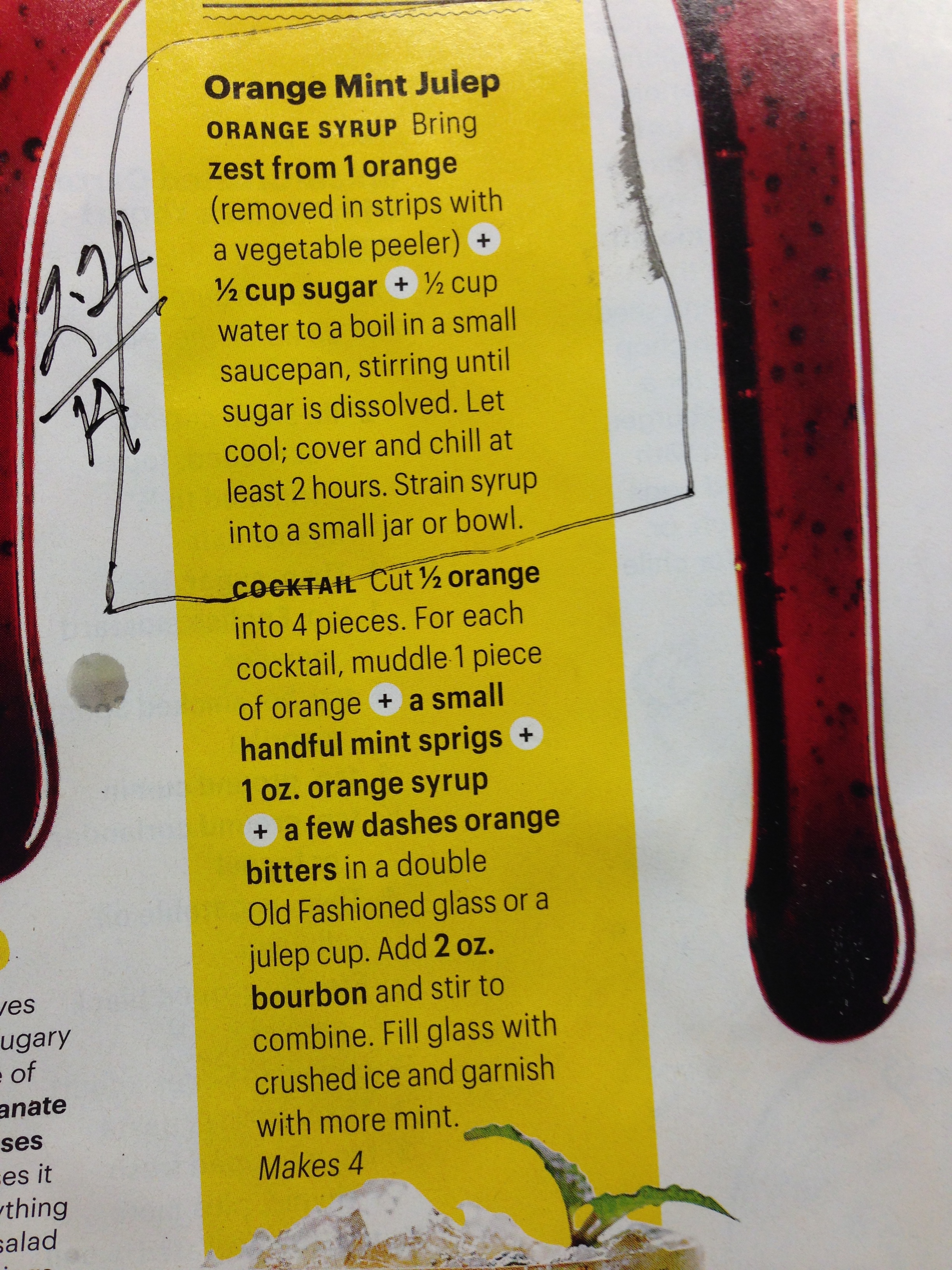 For each cocktail, muddle 1 piece of orange, a small handful of mint sprigs, 1 oz. orange syrup, and a few dashes of orange bitters in a double Old Fashioned glass or a julep cup. Add 2 oz. bourbon and stir to combine. Fill glass with crushed ice and garnish with more mint.