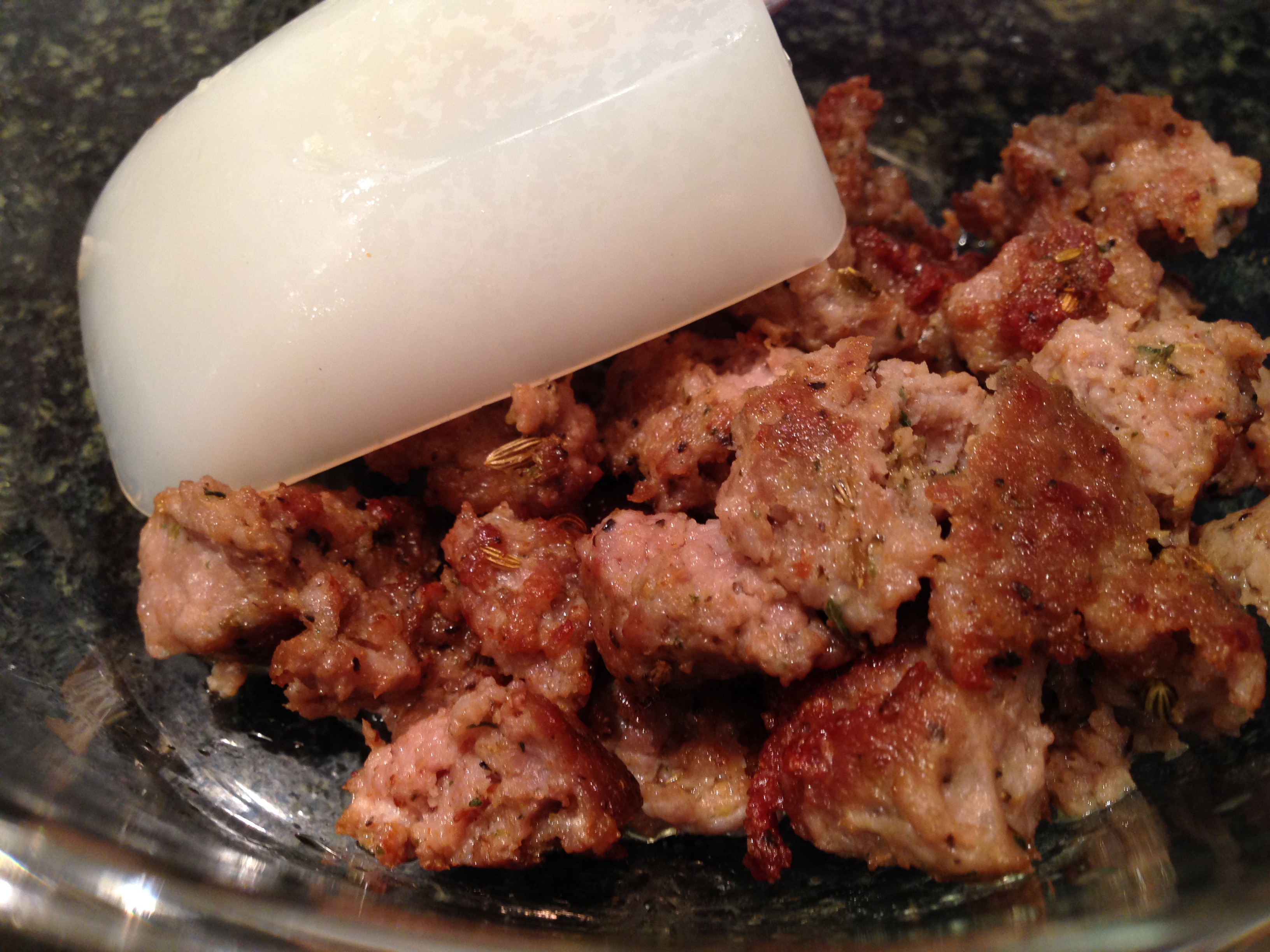 Melt the butter with the oil in a cast iron or nonstick pan over medium-low heat. Add the sausage meat and cook for 10 minutes, breaking up the meat with a wooden spoon or high heat spatula. Remove to a bowl with a slotted spoon; reserve.