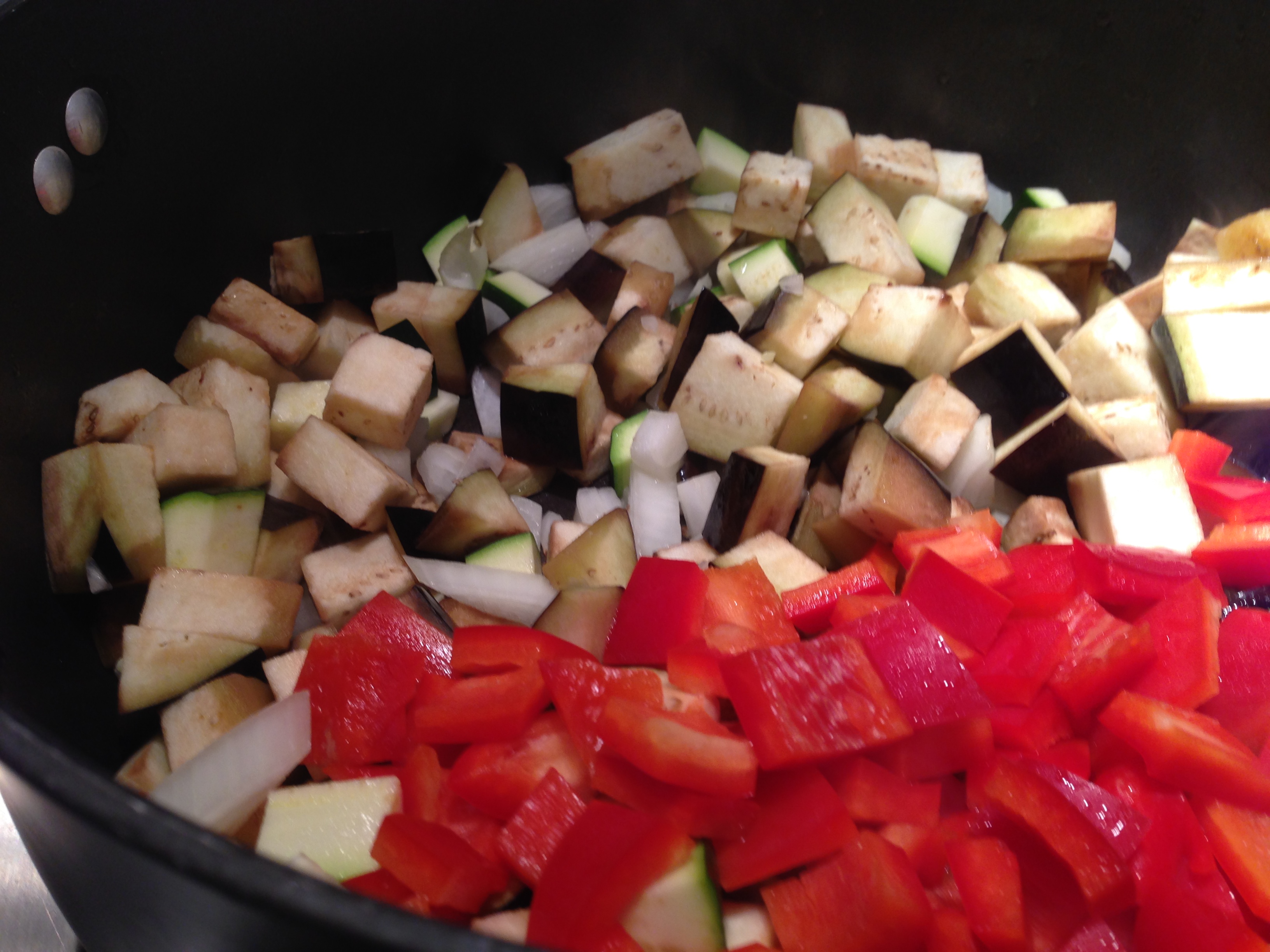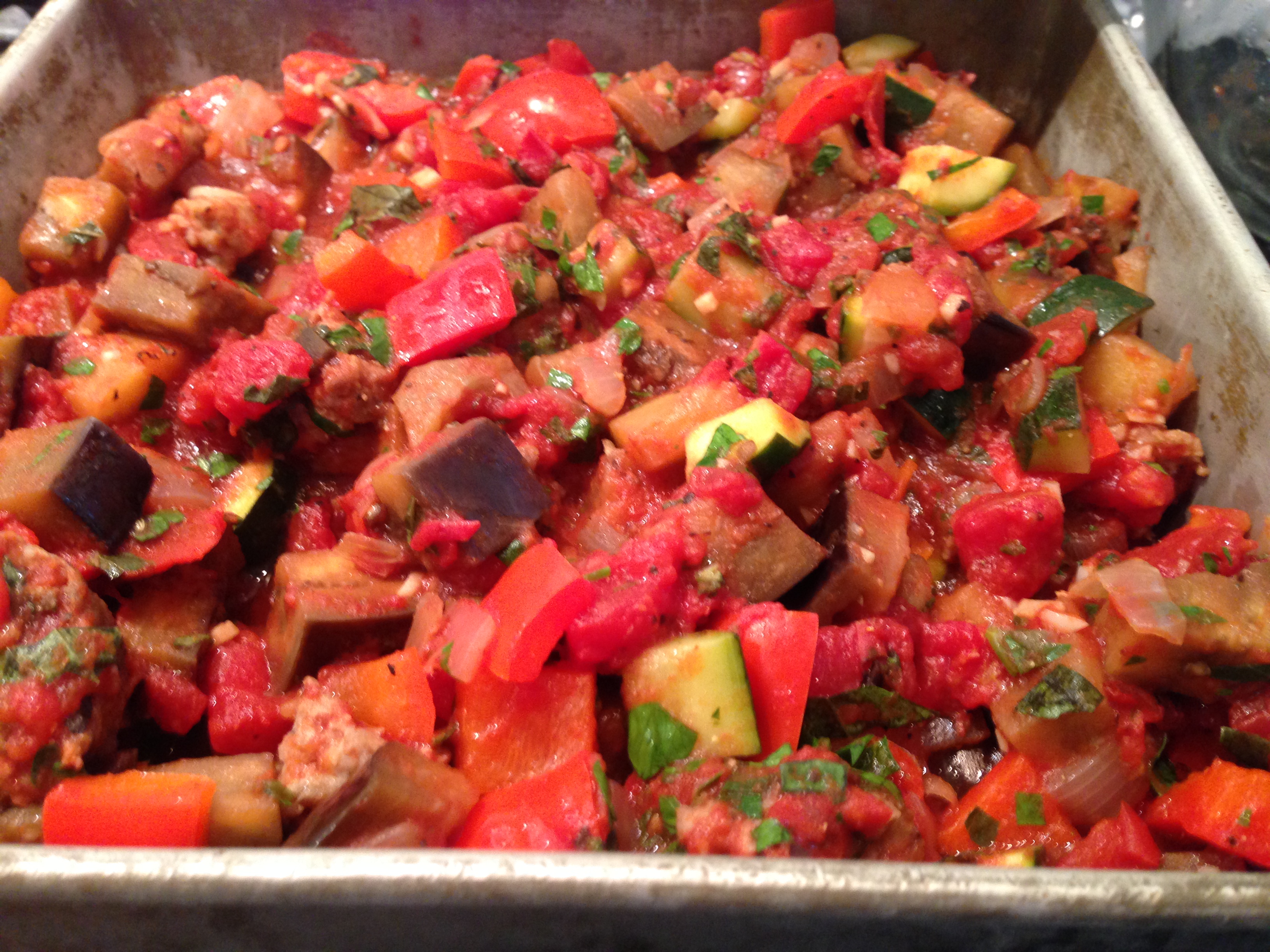 Having learned my clients enjoy eggplant, this recipe seemed like a winner. The first time I made it fairly close to the original recipe, and ever since I have adapted it to match the ingredients I have on hand. Sometimes I use chicken sausage instead of pork.