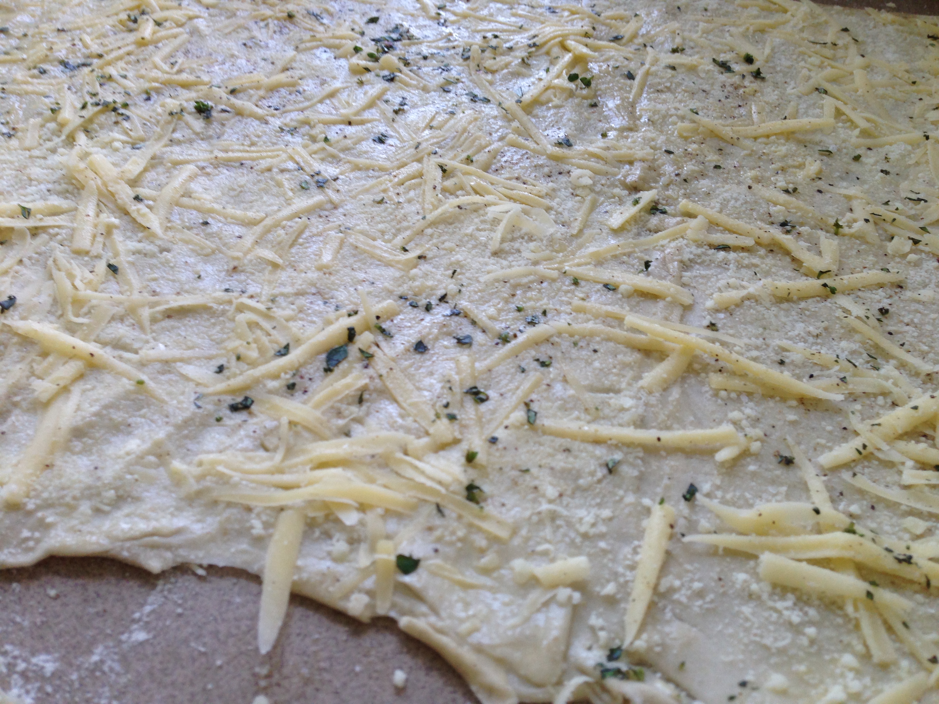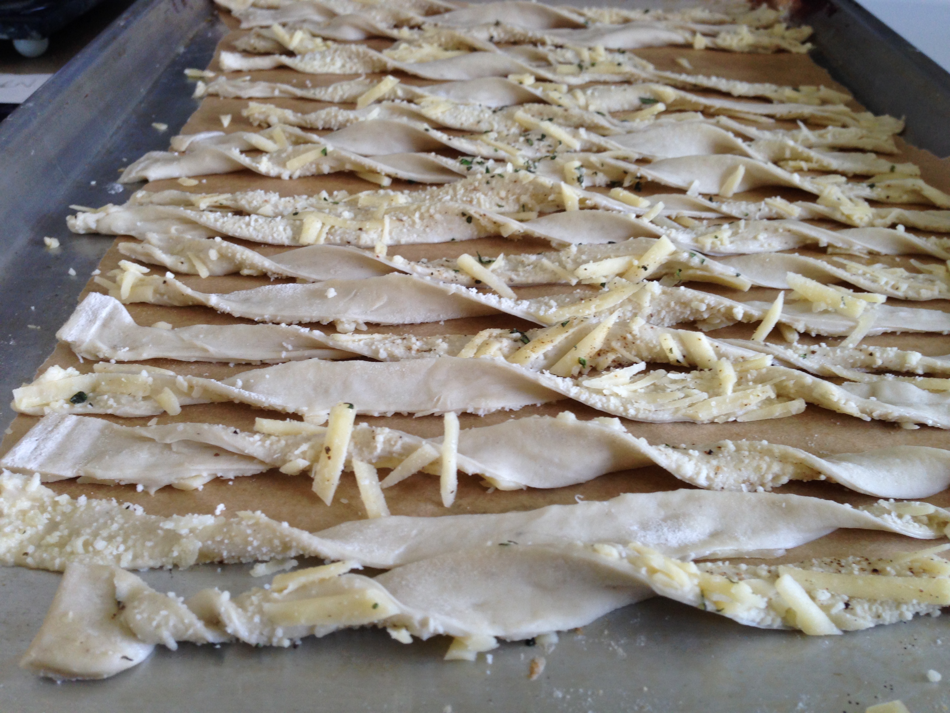 Cut each sheet crosswise with a floured knife or pizza wheel into 11 or 12 strips.