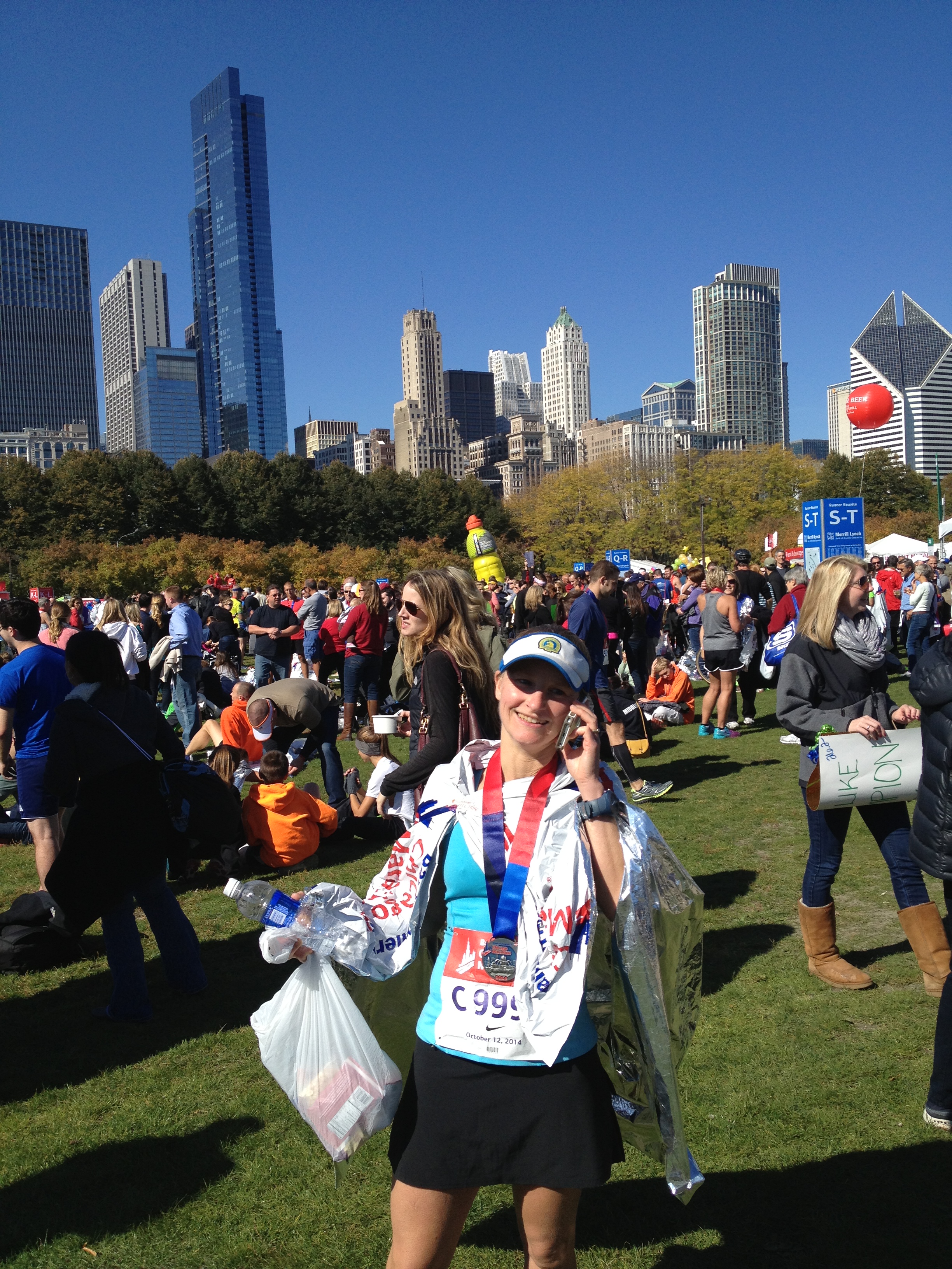 Below: Here I am in the meet-up area after the race, sharing my good news with my husband back in Seattle.